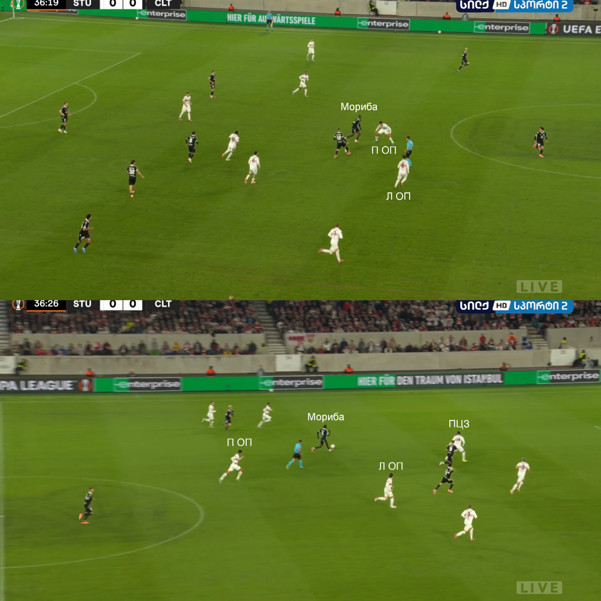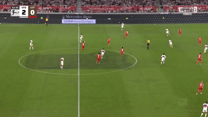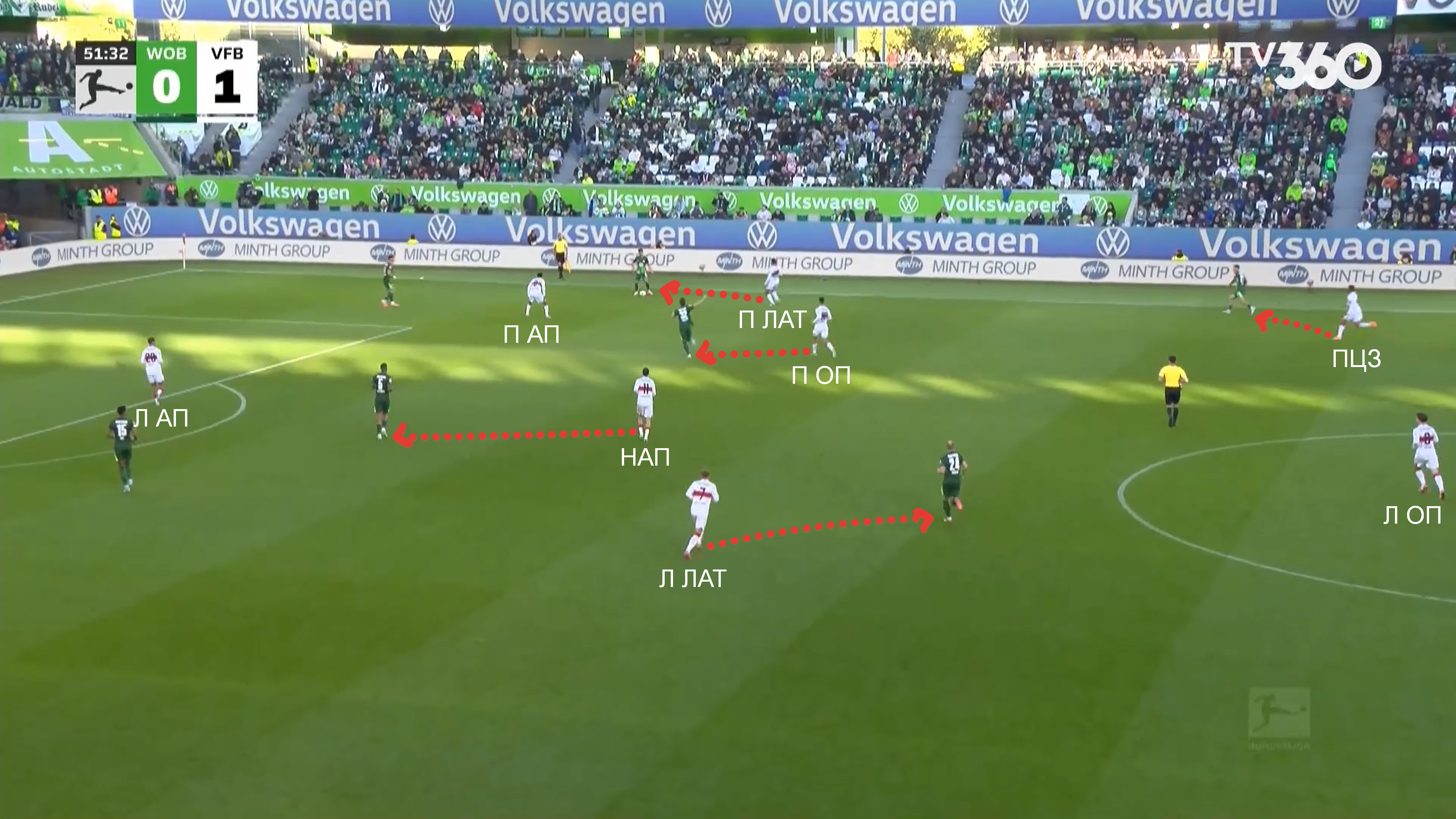 Контрпрессинг «Штутгарта» уязвим к забеганиям полузащитников из глубины. Опорник в активной зоне играет и переключается по мячу, а страховка не работает – дальний опорник возвращается назад в своей зоне, а КЦЗ остаётся в линии.