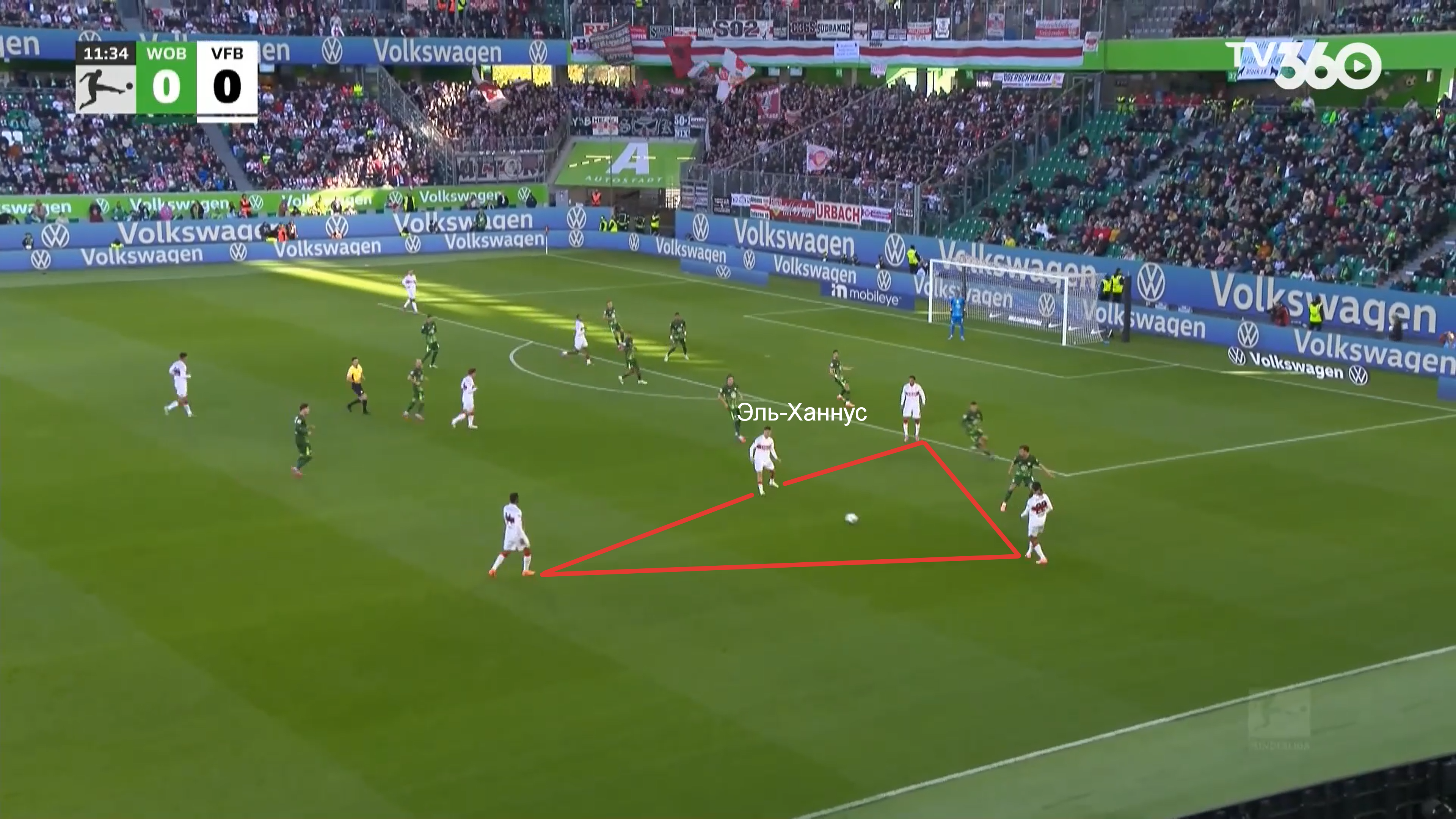 При выходе со своей половины «Штутгарт» использует структуру 4-2-1-3 – левый латераль поднимается в последнюю линию, а левый центральный защитник смещается на фланг. Вингеры могут как сужать, так и создавать ширину, десятка Эль-Ханнус свободно перемещается между линиями и выполняет роль связующего, а дальний крайний защитник обычно располагается выше ближнего и заполняет полуфланг. Один из опорников предлагает себя под мяч, а второй занимает позицию выше и прячется за спиной соперника, но по ходу эпизодов они могут меняться. Обычно ротация происходит во время смены фланга или при возвратах мяча вратарю. Конечная цель этих перемещений в том, чтобы вывести опорника в высокой позиции лицом к чужим воротам прямым пасом или игрой на третьего.